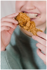 Crop anonymous happy female eating and enjoying spicy tasty chicken in hands and smiling