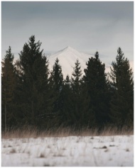Scenic winter view of snow-covered mountain and pi