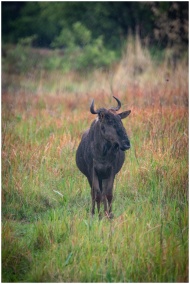 A lone gnu standing in a lush green and brown gras