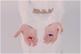 Close-up of hands holding red and blue pills, symbolizing a choice. Conceptual studio shot.