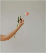 A graceful hand holding a single pink tulip against a soft, muted background.