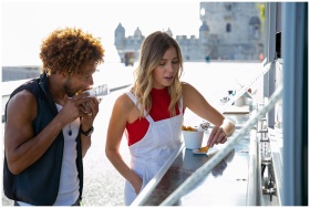 Woman eating fried potato with sauce standing near black boyfriend biting tasty burger at food truck