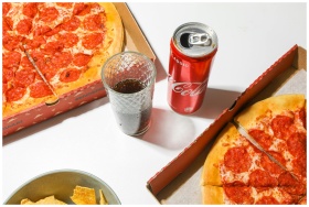 Close-up shot of pepperoni pizza and Coca-Cola can