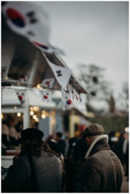 Bustling Korean street food market with people and flags, capturing lively urban atmosphere.