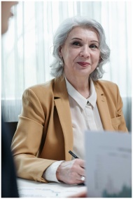 Senior businesswoman with gray hair smiling during a professional meeting.