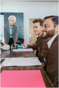Group of professionals in a meeting discussing tea