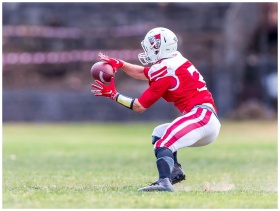 A football player in red uniform dramatically catc
