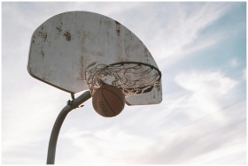 Basketball sinking into hoop against a dramatic blue sky in Ottawa, Canada.