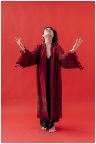 A woman in a red robe posed against a red background, embodying spirituality and elegance.