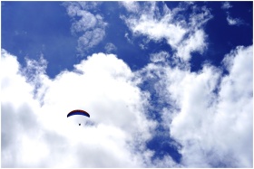 A paraglider soars through a bright blue sky filled with white clouds, capturing the essence of freedom and adventure.