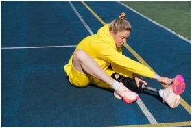 Woman in yellow sportswear stretches on track with prosthetic leg, promoting fitness and inclusivity.