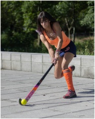 Focused female field hockey player in orange sportswear playing outdoors, demonstrating skill and agility.