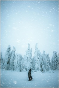 A lone person stands amidst snow-covered trees dur