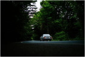 A vintage car drives through a lush, green forest road in Türkiye, creating a serene travel scene.