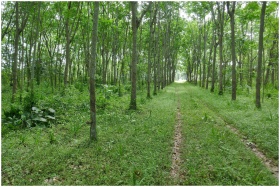 A serene forest path surrounded by tall green trees and lush vegetation.