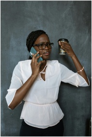 Businesswoman in a white blouse on a phone call, appearing frustrated while holding a coffee cup.