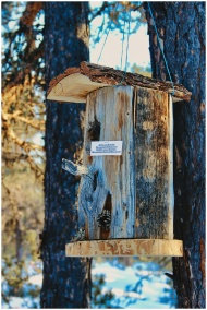 A rustic, handcrafted birdhouse dangling from a tree in a snowy woodland setting, captured in winter.