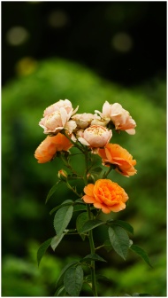 Close-up of blooming orange roses on a lush green
