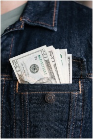 Close-up of US dollar bills in a denim jacket pocket, symbolizing wealth and finance.
