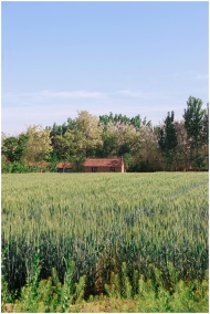 Tranquil rural scene with a farmhouse surrounded by green crops under a clear blue sky.