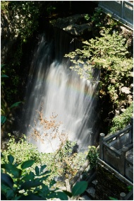 A tranquil waterfall with lush greenery and a subtle rainbow effect.