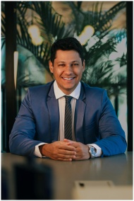 Confident businessman in a blue suit smiling at a desk in a modern office.