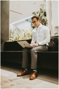 Businessman sitting with a laptop in a modern office environment, focused on work.