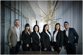 Diverse business team in formal attire posed in modern office.