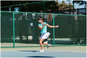 A young girl in action playing tennis on an outdoo