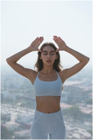 A woman in white activewear practices mindfulness outdoors with a cityscape backdrop.