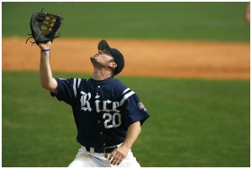 Baseball player in blue jersey catching a ball on a grassy field during a game.