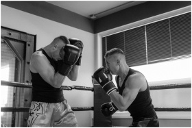 Intense black and white shot of two men sparring in a boxing ring. Captures the essence of combat sports.