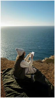A woman in a beanie enjoys a view of the sea from a cliff in Lisbon, Portugal.