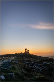 Scenic view of a lighthouse on a mountain at sunset with a rocky foreground.