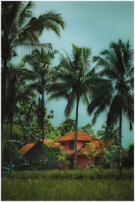 Idyllic tropical view of lush palm trees surrounding vibrant houses in Indonesia.