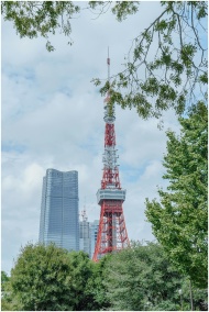 Scenic view of Tokyo Tower surrounded by trees in Minato City under a clear sky.