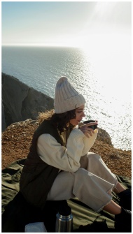 Woman sitting on a cliff with a drink, enjoying th
