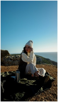A woman sits by the seaside with a thermos, enjoying a peaceful outdoor moment.