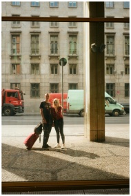 A young couple with luggage stands on a city sidewalk, reflected in a building's window.