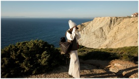 Woman in warm attire photographing a breathtaking ocean cliff during golden hour.
