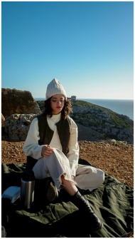 A woman in a beanie enjoying the view by the rocky coast under bright daylight.