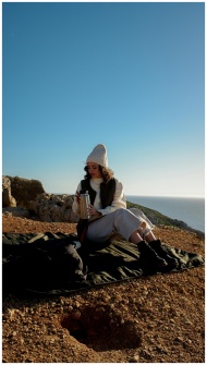 Woman with a knit hat sits outdoors enjoying a hot beverage with a scenic mountain view.