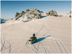 Drone captures people on a van amid a snow-covered mountain landscape in winter.