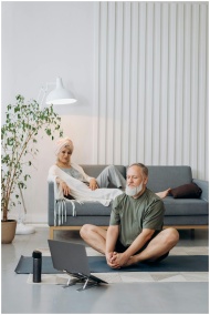 Senior couple practicing yoga and relaxing on the sofa indoors, embracing a healthy lifestyle.