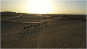 A stunning aerial view of a camel caravan crossing