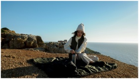 Young woman with thermos enjoys picnic by the ocean on a sunny day.