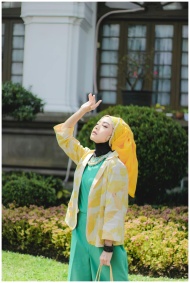 Fashionable woman in colorful attire enjoying a sunny day in a garden in Bandung, Indonesia.