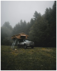 Explore adventure camping with a rooftop tent in a foggy forest meadow.