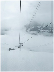 Cable cars ascending snowy mountains through misty