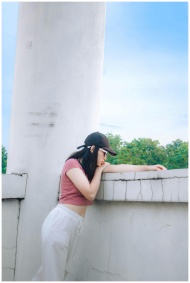 A woman in a pink crop top and black cap gazes thoughtfully outdoors in Cimahi, Indonesia.
